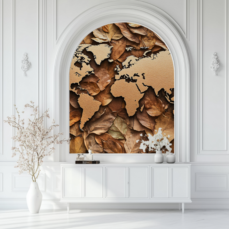 The Wood Leaf World Map Wallpaper stands out with its unique design, combining natural leaves with a world map motif. The brown and gold tones create a warm and soothing atmosphere, perfect for a modern lifestyle.