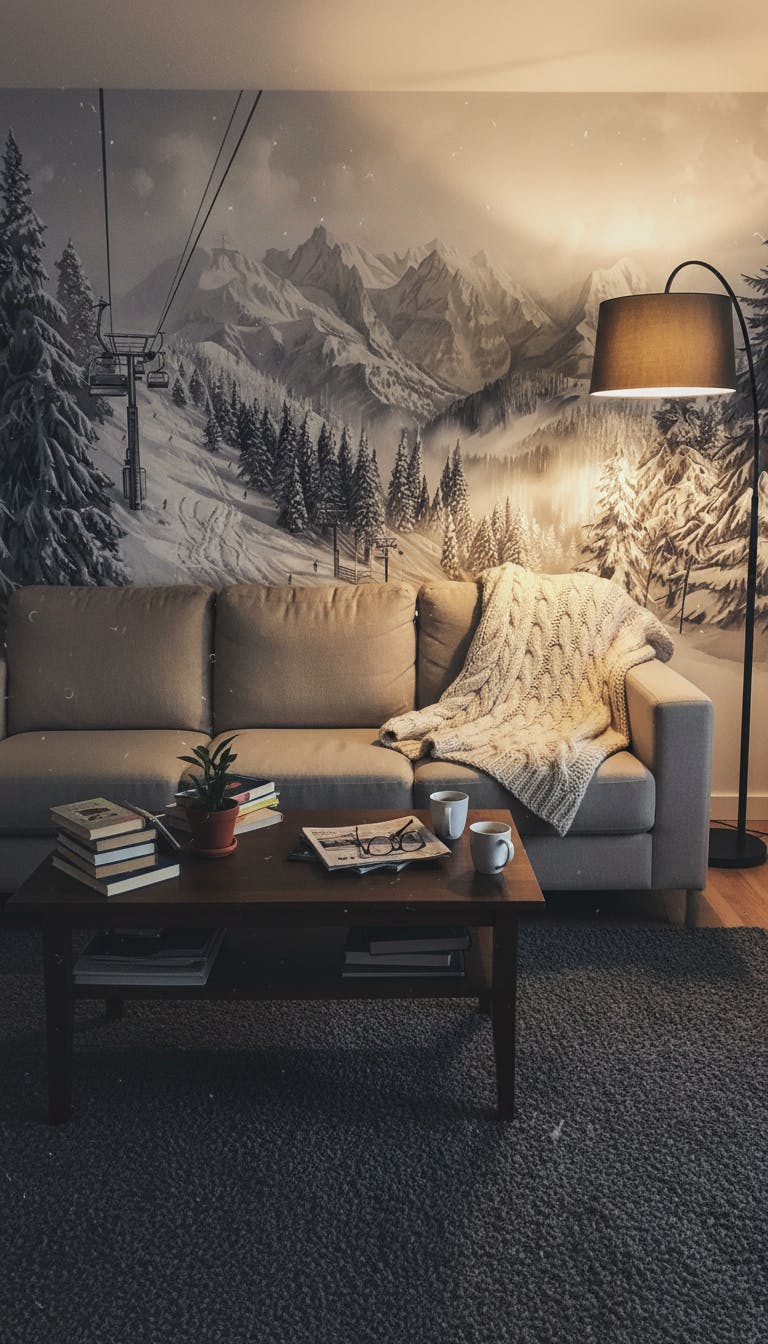 The silhouettes of the cable cars blend seamlessly into the winter landscape, while the snow-capped peaks add a dimension of visual depth. This wallpaper draws on the timeless elegance of black and white to adapt to various interior design trends, making each room both modern and nostalgic.