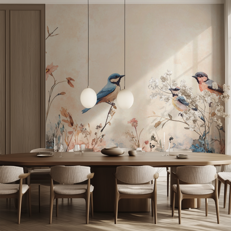Installing this wallpaper in your living room or bedroom can transform the space into a peaceful haven. The floral and bird motifs add an artistic dimension and a touch of sophistication, making the room more welcoming.
