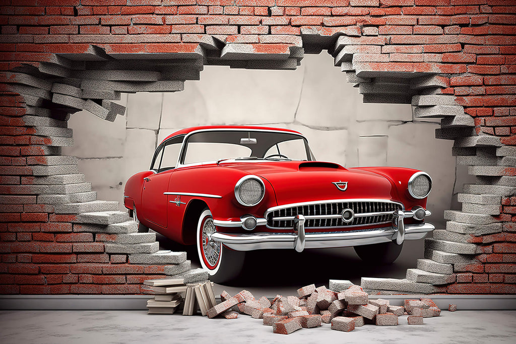 Le design audacieux du Papier Peint Chambre Garçon 3D met en scène une voiture rétro rouge surgissant d'un mur de briques, créant une illusion impressionnante et fascinante. Ce motif unique utilise des nuances de rouge et de gris pour accentuer la profondeur et l'effet tridimensionnel.