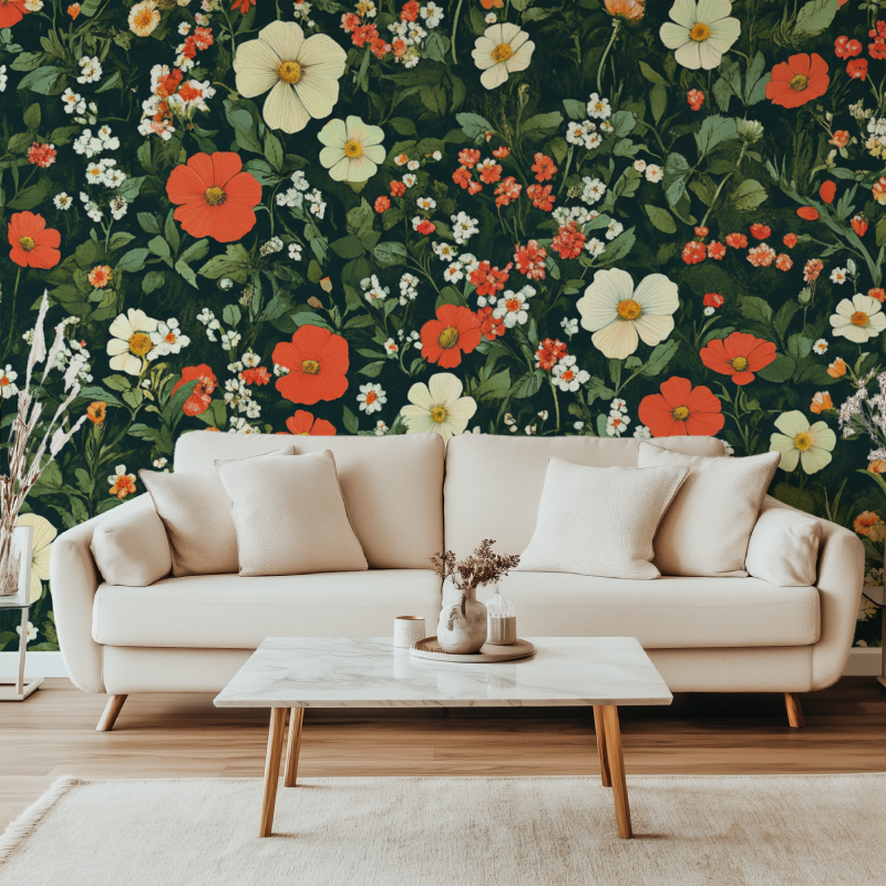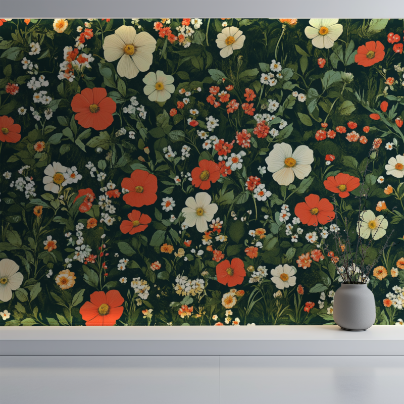 Le design unique du Papier Peint Fleur Animaux Vert se distingue par son mélange harmonieux de fleurs vibrantes et de feuillage luxuriant. La palette de couleurs, dominée par le vert riche avec des touches de rouge et de blanc, crée un effet visuel saisissant qui attire instantanément le regard.
