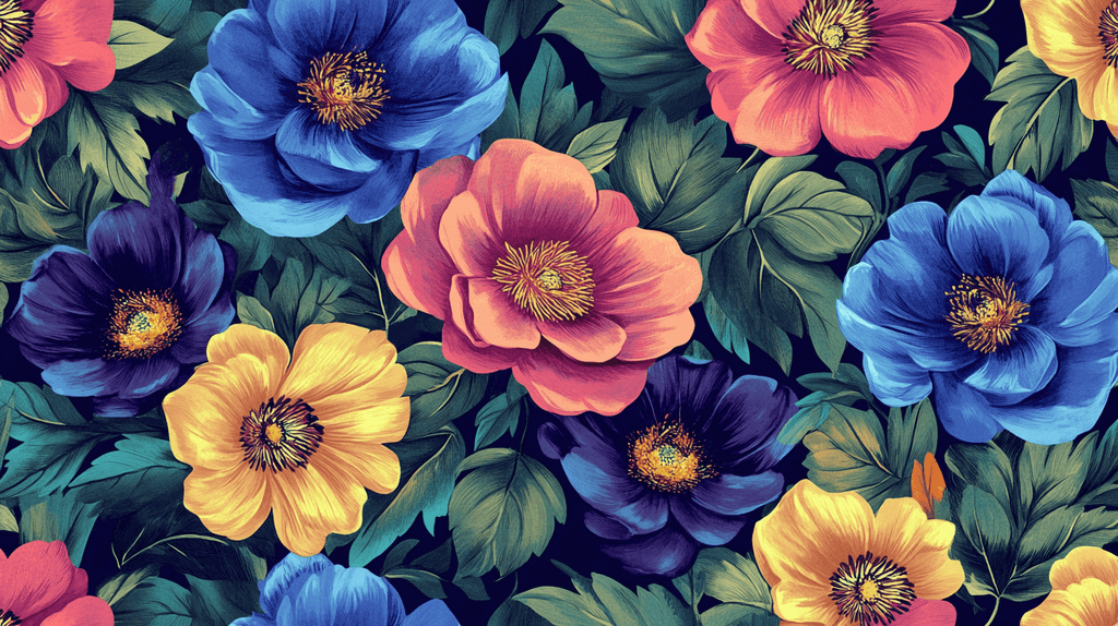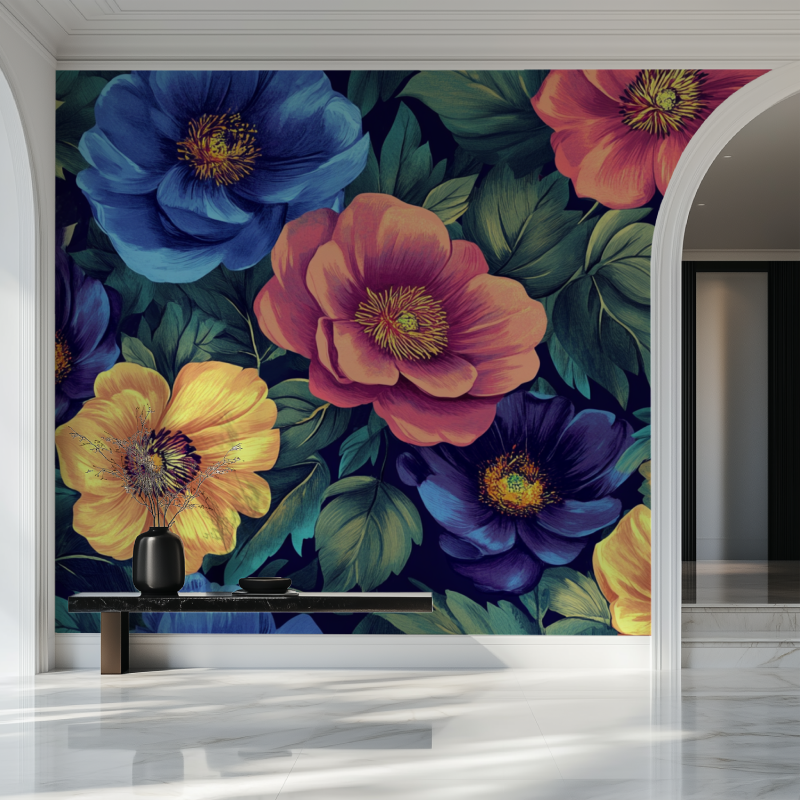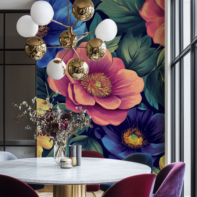 Le design unique du Papier Peint Fleur Annee80 combine des fleurs audacieuses aux couleurs vives pour créer un impact visuel saisissant. Les teintes multicolores, allant du bleu électrique au jaune vibrant, se chevauchent et se complètent, apportant éclat et dynamisme à vos murs.