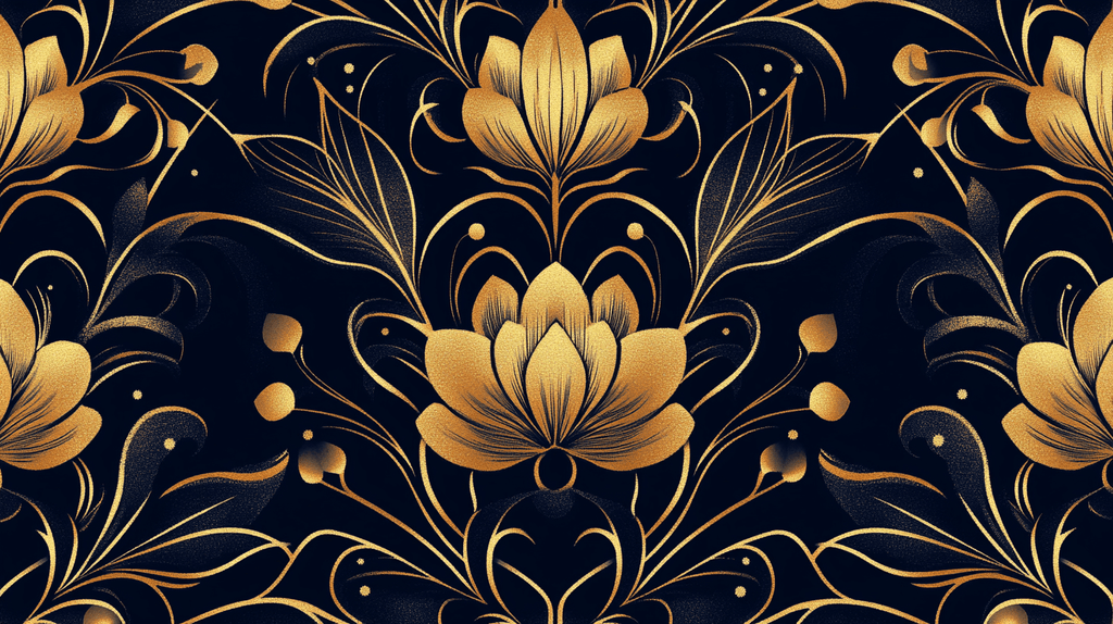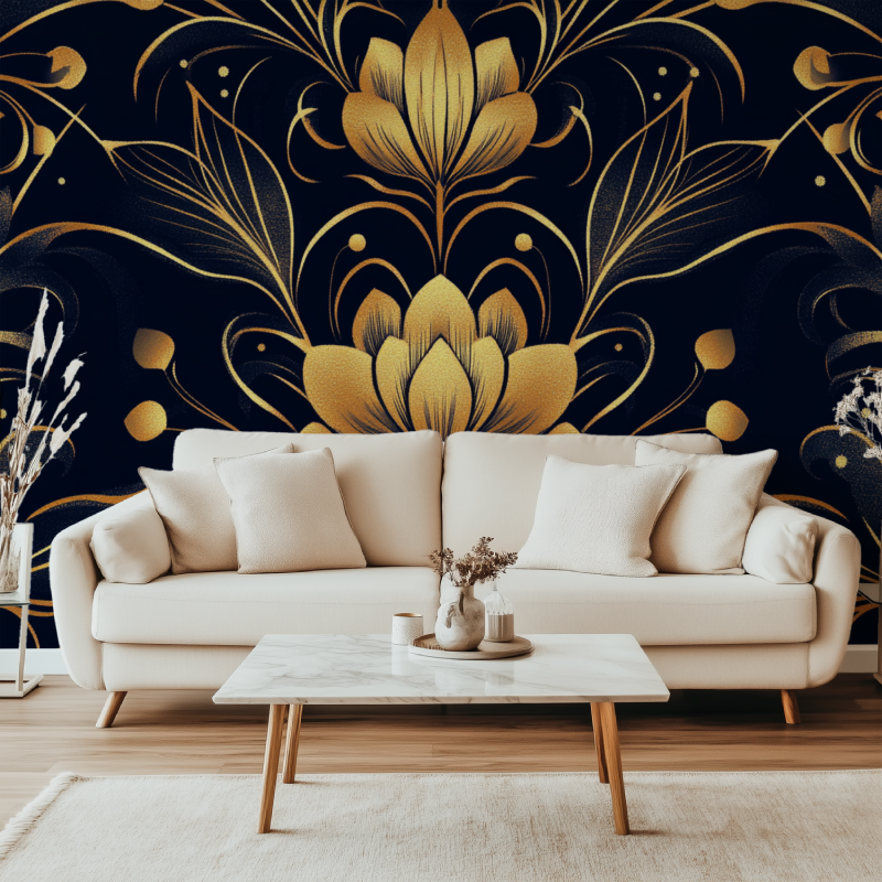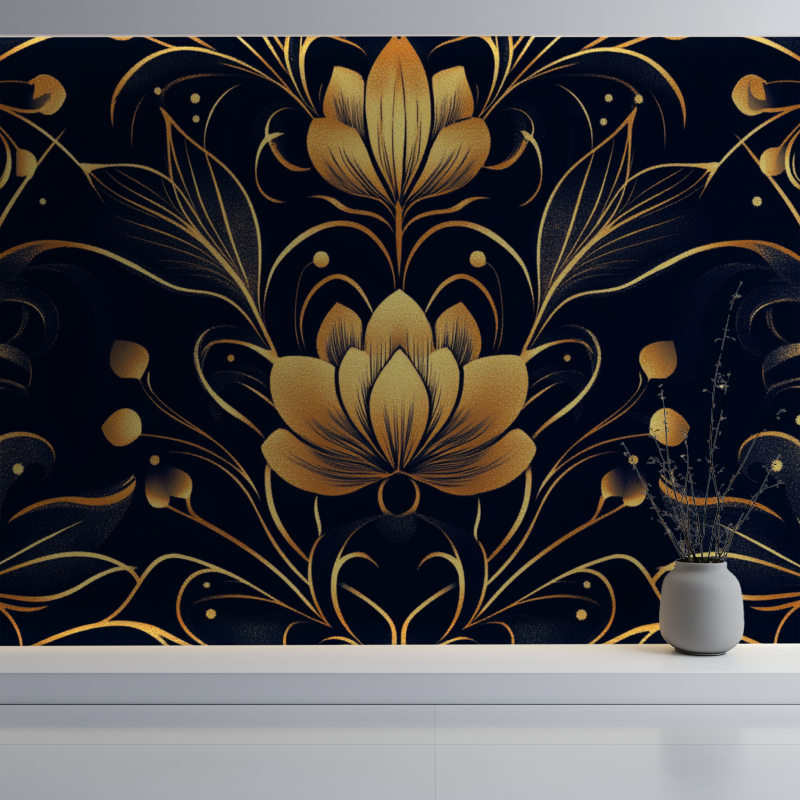 Découvrez l'élégance du Papier Peint Fleur Art Deco, une symphonie visuelle où chaque élément est minutieusement dessiné. Les motifs floraux dorés sur un fond noir créent une ambiance luxueuse et sophistiquée.