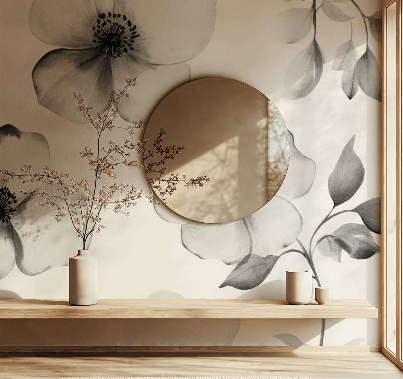 La texture douce et subtile du papier accentue les contours délicats des fleurs, rendant chaque pétale presque tangible. Cette combinaison chromatique sobre mais élégante est idéale pour les espaces contemporains et classiques, répondant aux tendances actuelles du design intérieur qui valorisent la simplicité et l'élégance.