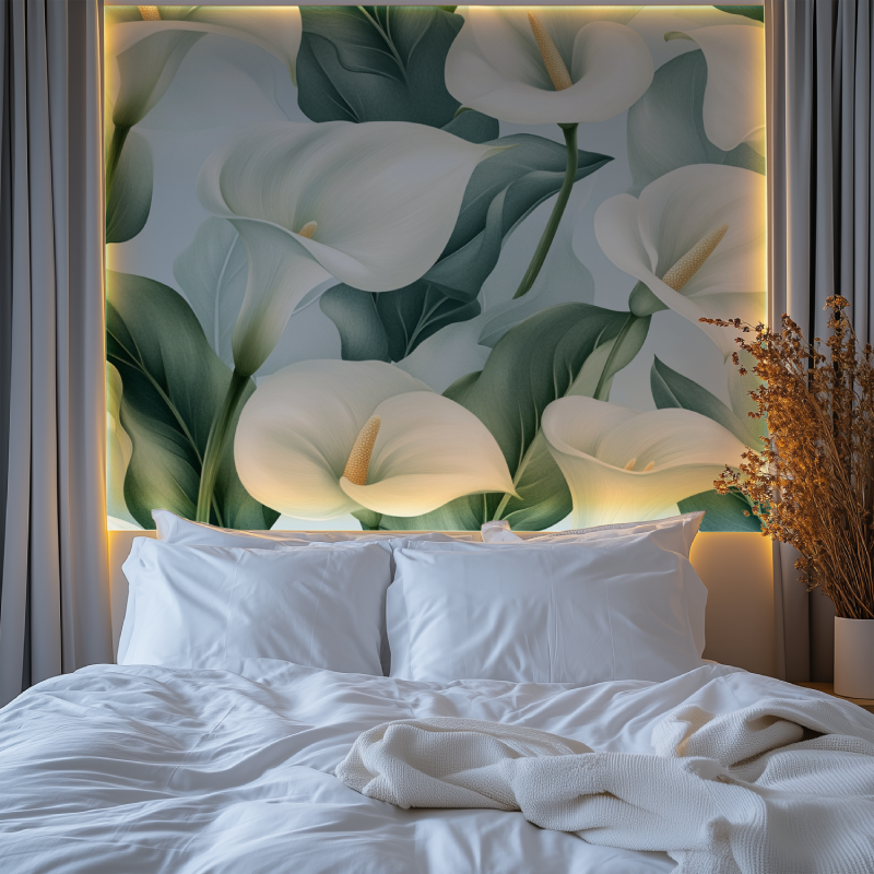 L'installation du Papier Peint Fleur Calla peut profondément transformer l'atmosphère de votre espace de vie. En apportant une sensation de calme et de luxe, il est idéal pour des pièces comme le salon, la chambre adulte, ou même un espace de travail.