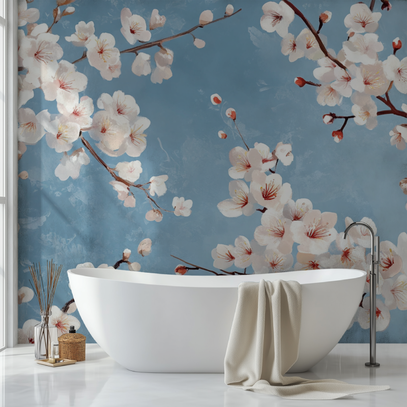 Le design du Papier Peint Fleur De Cerisiee est une véritable ode à la nature. Avec ses branches délicates de cerisiers en fleurs sur un fond bleu apaisant, ce motif apporte un charme naturel et élégant à tout espace.