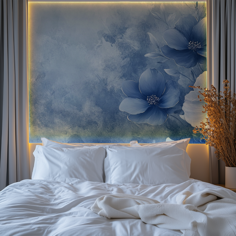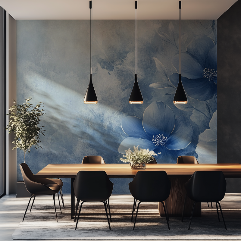 Le contraste des fleurs bleues sur le fond crée une profondeur visuelle qui attire naturellement le regard, faisant de ce papier peint une pièce maîtresse dans n'importe quelle pièce. Les couleurs soigneusement choisies s'harmonisent parfaitement, offrant une ambiance apaisante mais chic, idéale pour ceux qui souhaitent suivre les tendances de décoration intérieure tout en gardant une touche personnelle et originale.