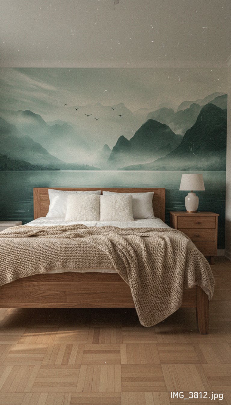Ce motif de montagne est accentué par un effet de brume et de vol de oiseaux, ajoutant de la profondeur et du dynamisme à la pièce. Idéal pour les chambres ou les salons, ce papier peint apporte une atmosphère relaxante et sereine qui complète harmonieusement les tendances de décoration contemporaines.