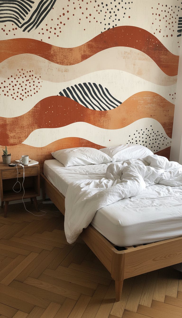 Le Papier Peint Terracotta Inspiration Japandi se distingue par son design à la fois épuré et raffiné. Les vagues de différentes nuances de terracotta et de lignes noires ajoutent une touche de modernité tout en restant chaleureuses.
