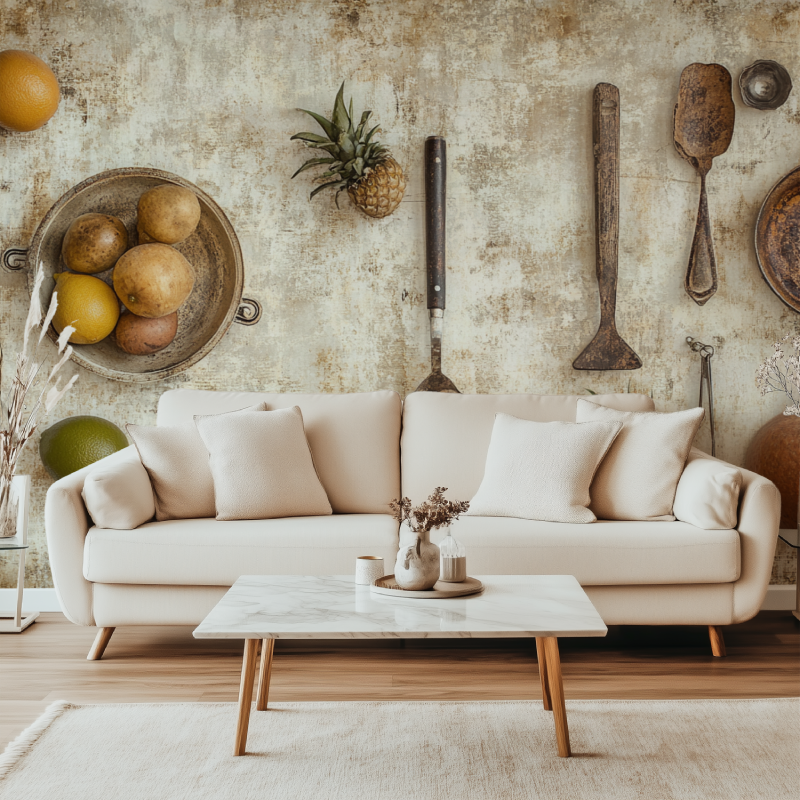 Le Papier Peint Vintage Cuisine se distingue par son design unique qui allie élégance et authenticité. Les motifs d'objets de cuisine anciens, intégrés dans un fond avec textures vieillies, donnent un charme rétro et nostalgique à toute pièce.