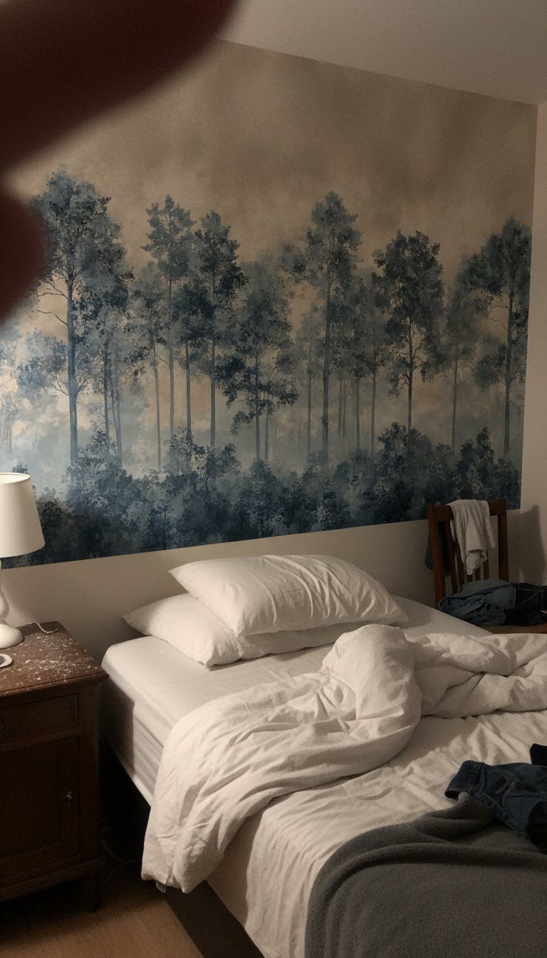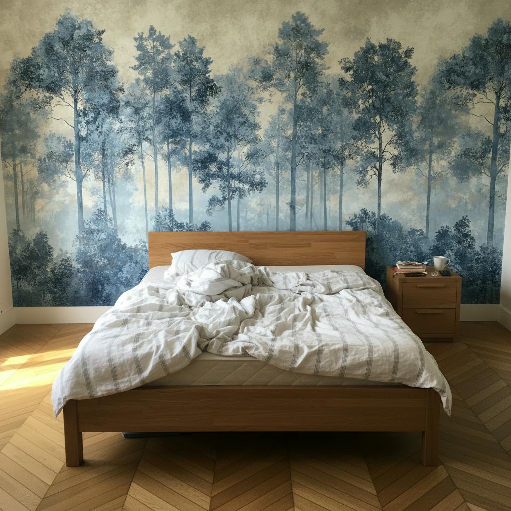 Le Papier Peint Vintage Forêt présente un design audacieux et captivant de forêt, alliant des nuances de bleu et de beige pour créer un thème élégant et serein. Les arbres délicatement peints ajoutent une touche de nature, créant une ambiance paisible et relaxante dans n'importe quelle pièce.